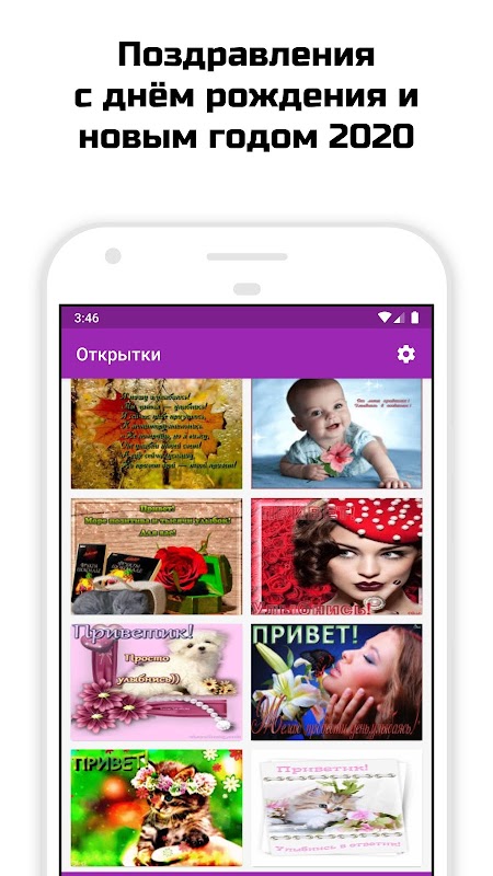 Вам необходимо придумать красивое поздравление с днем рождения для любимой, любимого, друга, подруги, найти смешную и прикольную открытку для коллеги или может быть просто отправить приятные слова в виде пожелания для дорого го вашему сердцу человека? Теперь это не проблема, ведь вы всегда можете воспользоваться нашим приложением, в котором собрана большая коллекция живых картинок и поздравлений на все случаи жизни и на каждый день, разбитых на различные популярные категории (например, поздравления с Новым годом 2020 или рождеством, поздравления от деда мороза, поздравления с днём рождения, поздравления с днем рыбка, поздравления с юбилеем и так далее). А благодаря встроенному календарю событий вы всегда будете в курсе ближайших праздников и событий, и теперь никогда не забудете поздравить дорогих вам людей.