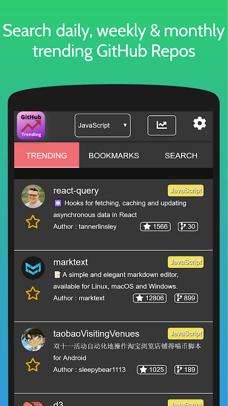 다크 모드, 북마크가 있는 Github Trending Daily Popular Repositories API