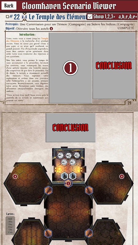 Gloomhaven 시나리오 뷰어를 사용하면 아직 열지 않은 방, 몬스터, 특별 섹션 및 결론을 숨긴 보드게임의 모든 시나리오를 로드할 수 있습니다.