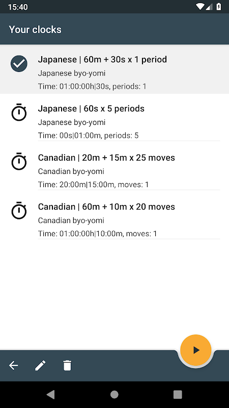 Go 및 Shogi 게임에 미리 정의 된 다양한 타이머를 사용하거나 나만의 타이머를 만들 수 있습니다.