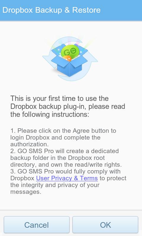 Dropbox Backup & Restore plug-in is a GO SMS Pro paid feature that enables you to backup SMS, MMS as a compressed file and save to your Dropbox folder.