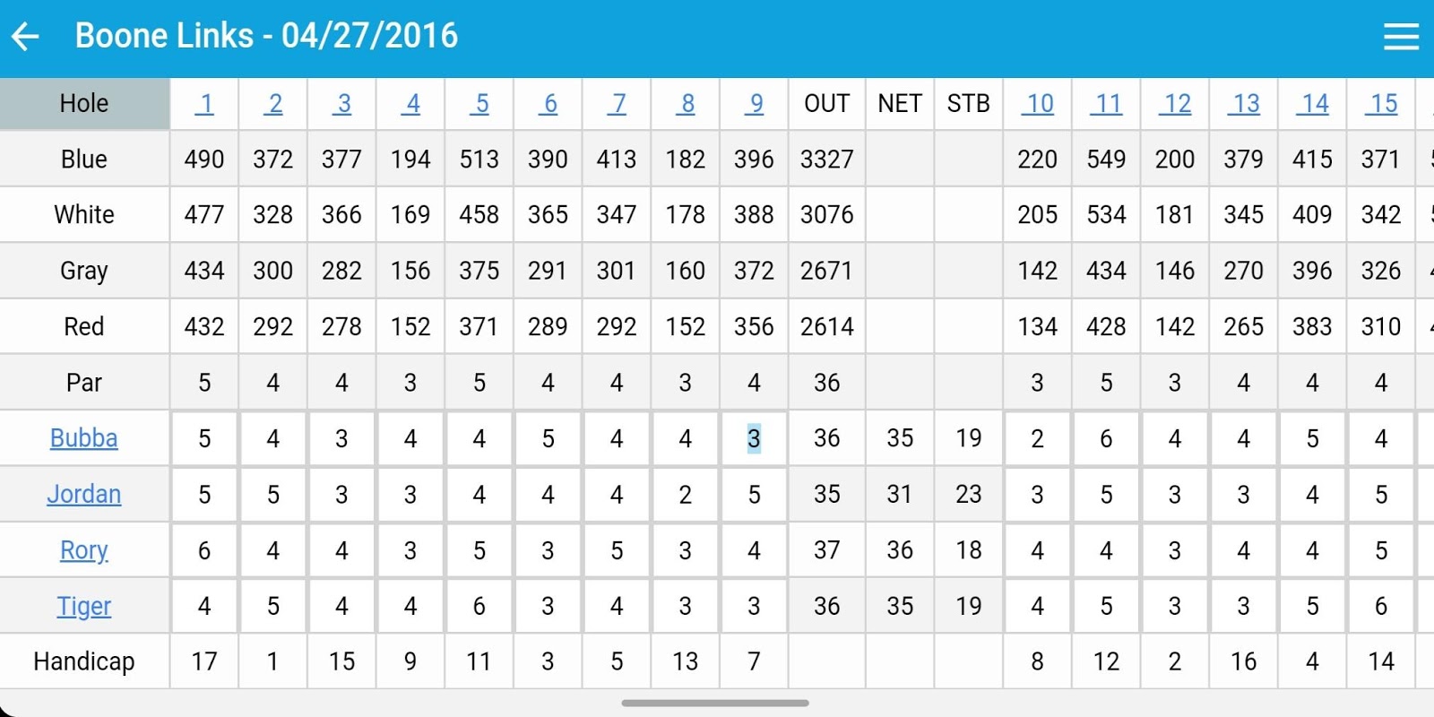 9. 핸디캡-설정 페이지에는 핸디캡 옵션이 있으며,이를 통해 라운드에서 각 플레이어에 사용할 코스 핸디캡을 추가 할 수 있습니다. 핸디캡 옵션이 설정되어 있고 플레이어가 코스 핸디캡을 설정 한 경우 스코어 카드는 코스 핸디캡을 사용하여 계산 된 순 점수를 표시합니다. Stableford 포인트 계산에는 Net Score도 사용됩니다.