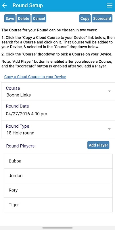 5. 플레이어-플레이어를 직접 만들거나 클라우드에서 기존 Real Golf Scorecard 사용자를 복사하여 장치에서 플레이어로 사용할 수 있습니다.