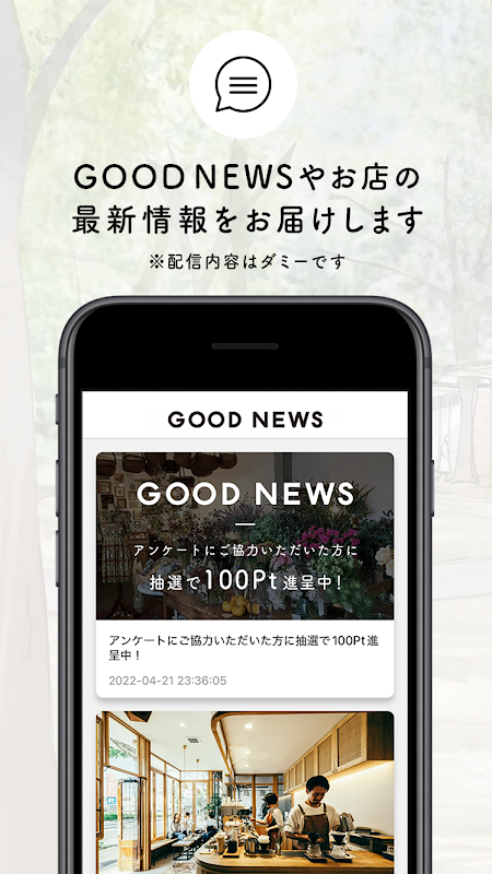 신상품이나 이벤트 등 최신 정보를 재빨리 체크해, 쇼핑도 즐길 수 있는 GOOD NEWS 공식 어플은, GOOD NEWS Online Shop에서 등록해 주신 회원 ID, 패스워드와 공통으로 이용하실 수 있습니다. 각 점포나 온라인 숍 GOOD NEWS가 임하는, 자연 환경을 배려한 프로젝트에 대해서 전달하고 있습니다. 회원 한정 스페셜 체험 이벤트와 기쁜 특전도 기획중!