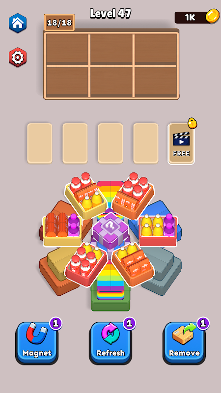 탭하여 상자를 슬롯으로 이동하고 다양한 색상의 상품을 선반으로 이동하세요.