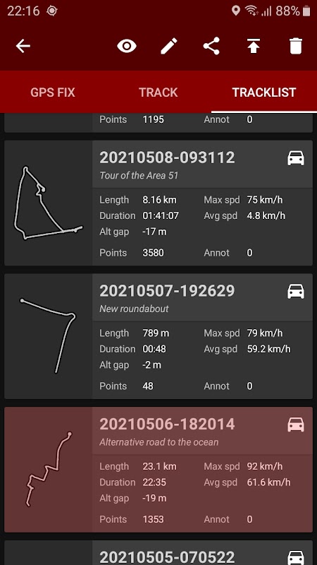 모든 여행을 기록하고 인앱 트랙리스트에서 직접 설치된 외부 뷰어로 볼 수 있으며 다양한 방법으로 KML, GPX 및 TXT 형식으로 공유할 수 있습니다.