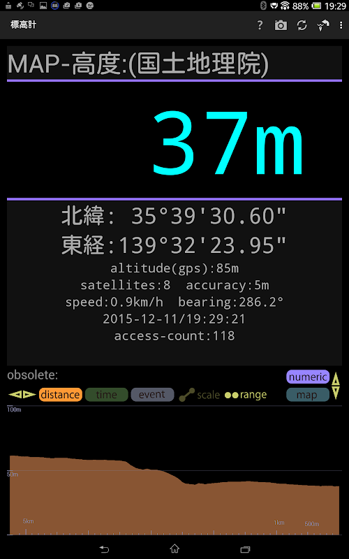 現地点の地面高度(標高)を移動に伴い刻々と表示します。