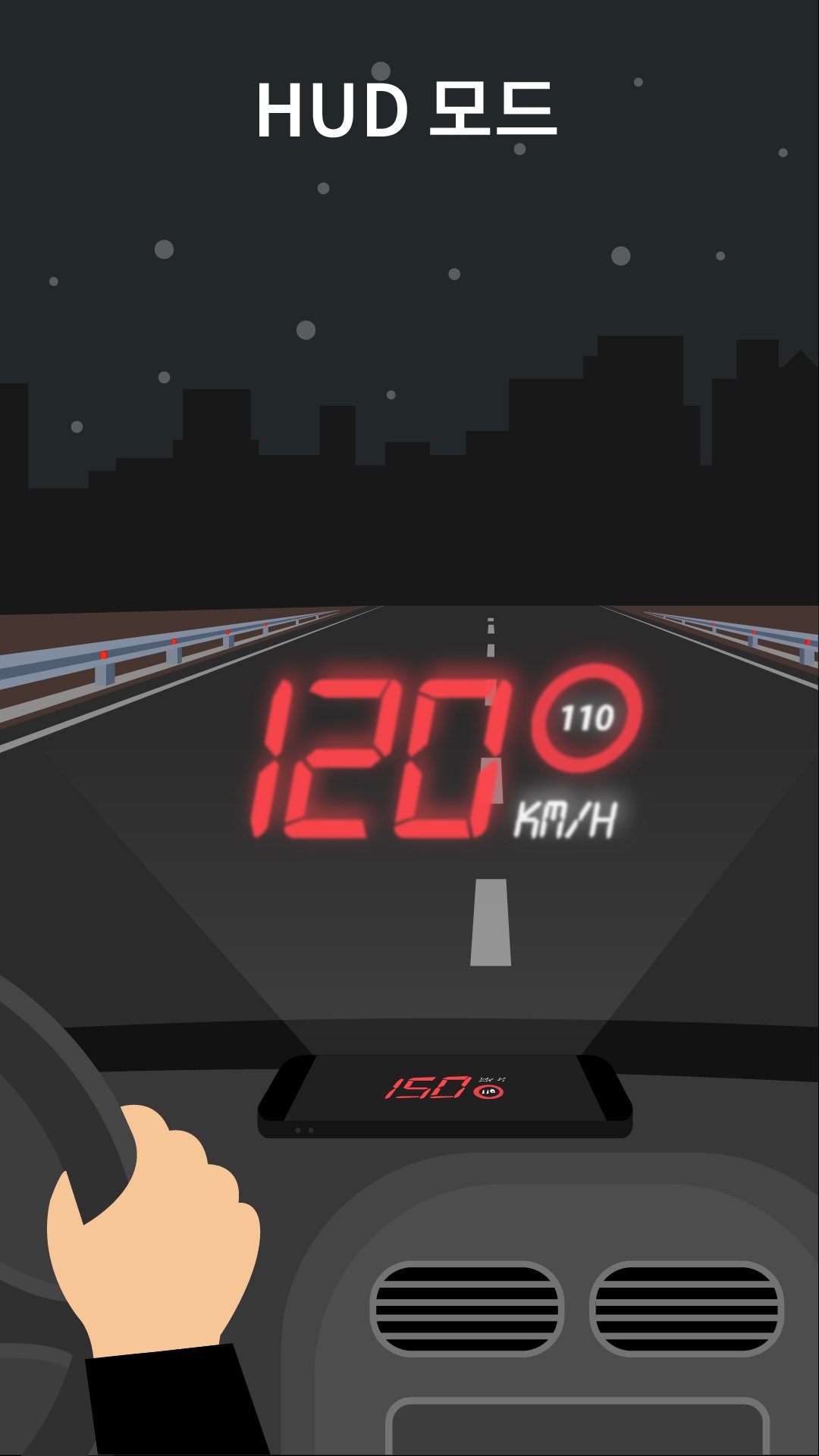 현재 속도를 차량 전면 유리에 투사하여 야간 주행 시 가시성을 높여줍니다. HUD 모드는 깔끔하고 단순하며, 손을 사용하지 않고도 쉽게 볼 수 있는 화면을 제공하여 더 안전한 주행을 도와줍니다.