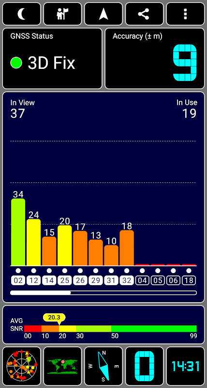 이 앱을 사용하면 해당 지역의 GPS 수신을 확인하고 AGPS 데이터를 업데이트하여보다 빠른 수정 시간을 얻을 수 있으며 다른 GPS 및 센서 데이터를 볼 수 있습니다. 이 앱은 고도, 정확한 UTC 및 현지 시간, 나침반 방향, 달의 위상 및 일광 시간과 같은 원 스톱보기 역할을합니다. GPS, GLONASS, GALILEO, SBAS, BEIDOU 및 QZSS 위성을 지원합니다. 이 앱에는 야간 모드를 포함하여 취향에 따라 변경할 수있는 다양한 색 구성표가 있습니다. 색 구성표를 사용하여 앱과 함께 다른 도구와 일치시킬 수도 있습니다.