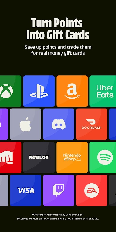 * Amazon, Visa, Apple, Twitch 등 기프트 카드로 교환할 수 있는 포인트 적립