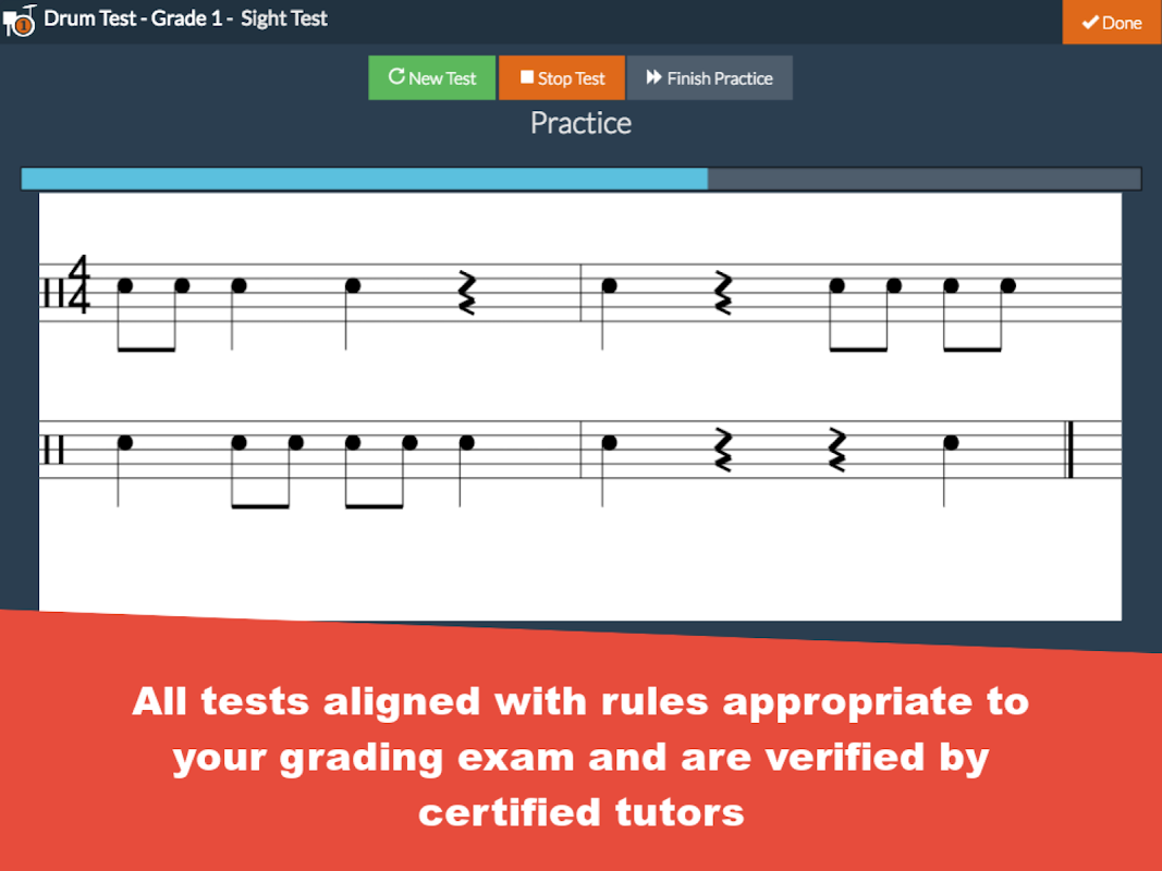 The ear and sight reading tests are a daunting aspect of your exam. Unlike the performance pieces and technical exercises you don't know what to expect so they can be difficult to practice for, especially without a tutor. Using the expert knowledge of our certified North London Drums tutors, the app will produce an infinite number of sight reading and ear tests examples, all within the rules and difficulty appropriate for your grade.