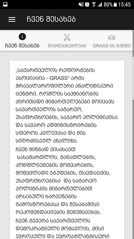„საქართველოს რეფორმების ასოციაცია – GRASS“ არის მრავალპროფილური ანალიტიკური ცენტრი, რომლის საქმიანობის ძირითადი მიმართულებები მოიცავს საქართველოს საგარეო, უსაფრთხოების, საჯარო პოლიტიკისა და საჯარო ადმინისტრირების სფეროს კვლევასა და მის სიღრმისეულ ანალიზს.