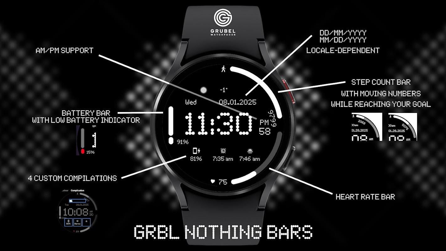각 기기는 서로 다른 맞춤 정보 표시를 제공하며 선택 항목은 타사 앱에 따라 다릅니다. 스토어 스크린샷에 표시된 사용자 정의 컴플리케이션은 타사 앱에서 가져온 것입니다 - 휴대폰 배터리 컴플리케이션