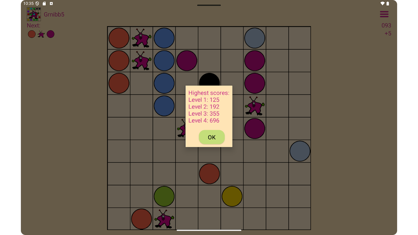 한 줄에 5 개 이상의 원을 얻어서 포인트 점수.