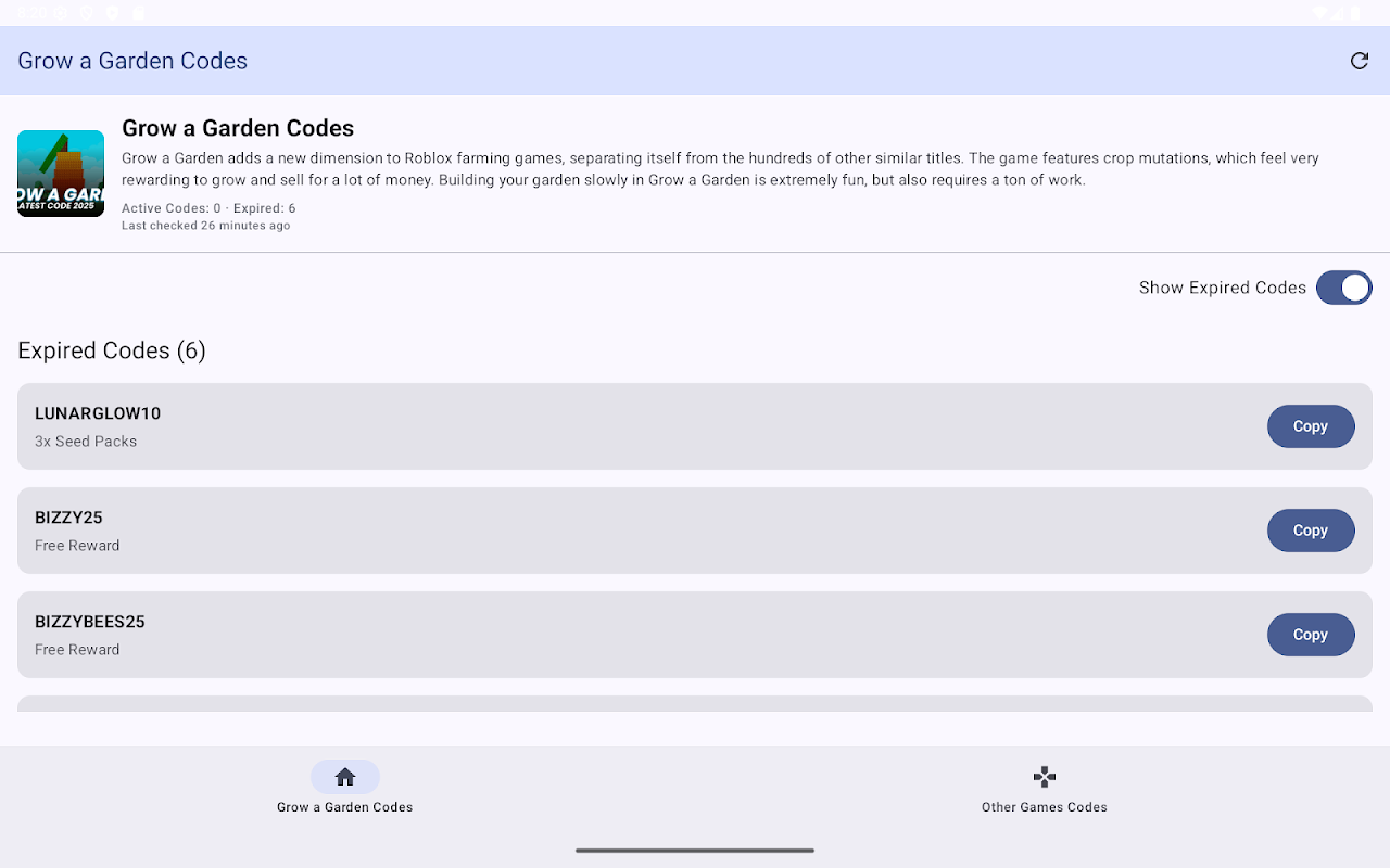 앱을 여는 순간, 가장 중요한 기능인 Grow a Garden의 모든 활성 코드 목록이 표시됩니다. 메뉴나 다른 화면을 탐색할 필요가 없습니다. 보상은 바로 눈앞에 있습니다.