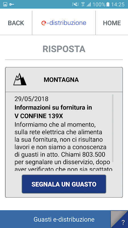 Nel caso in cui non ci siano dei lavori e/o guasti in corso per la fornitura in oggetto, tramite il pulsante “segnala un guasto”, potrai segnalare la presenza di una disalimentazione. Ti verrà quindi sottoposto un questionario, necessario per l’inserimento e la corretta gestione della segnalazione. A seguito della compilazione, ti verrà comunicato l’esito della richiesta. Notifiche SMS ti informeranno inoltre sullo stato della segnalazione.