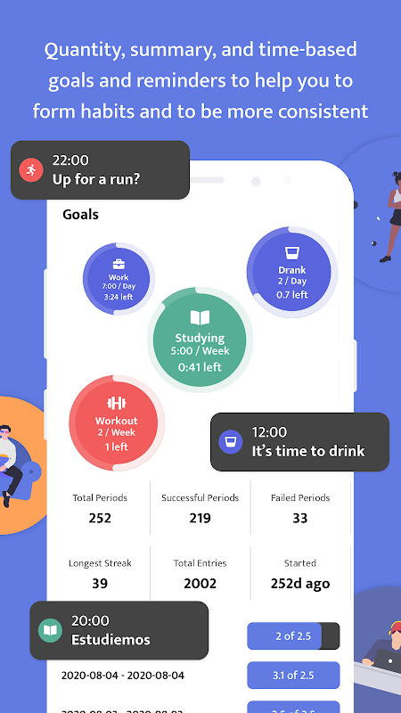 -습관을 형성하고 일관성을 유지하는 데 도움이되는 수량, 요약 및 시간 기반 목표 및 알림