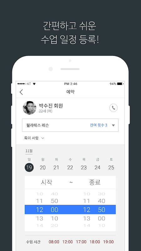 ▶ Gym mate Pro는 트레이너와 계약된 모든 회원과의 일정 등록이 가능하며 예약된 일정의 변경, 수업 완료 및 취소 처리가 PC 접속 없이 하나의 어플로 처리가 가능합니다.