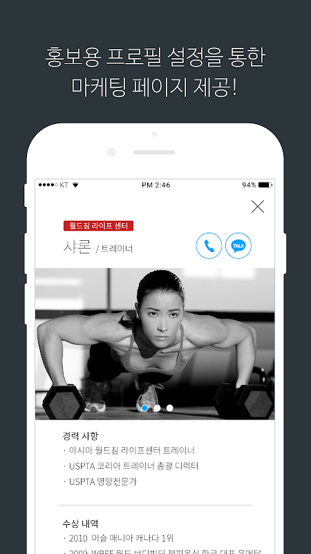 ▶ Gym mate Pro는 트레이너 개인의 프로필 페이지를 제공하며 자유로운 프로필 업데이트를 통해 트레이너와 소속 센터의 적극적인 홍보가 가능합니다.
