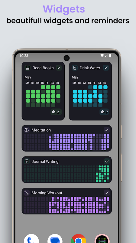 HabitRix는 새로운 습관을 만들거나 오래된 습관을 고치고 싶은 모든 사람에게 완벽한 습관 추적 앱입니다. HabitRix를 사용하면 아름다운 타일 기반 그리드 차트를 통해 진행 상황을 추적할 수 있습니다. 금연, 건강한 식습관, 운동량 증가 등 어떤 목표를 설정하든 HabitRix가 목표 달성을 도와드립니다. 색상, 아이콘, 설명을 조정하여 대시보드를 맞춤 설정할 수 있습니다. 습관 대시보드의 색상 타일 개수를 늘리면서 동기를 부여하세요.