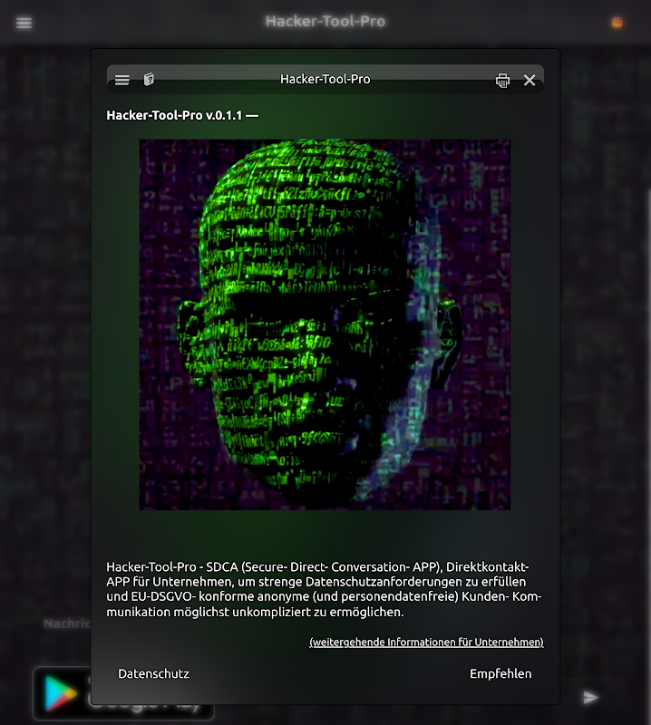 인공 지능의 해커 도구: Personal SDCA(Secure Direct Conversation App)를 사용하면 직접 통신할 수 있으며 EU-GDPR을 준수하는 익명(및 개인 데이터 없는) 고객 통신뿐만 아니라 엄격한 데이터 보호 요구 사항을 충족할 수 있습니다.