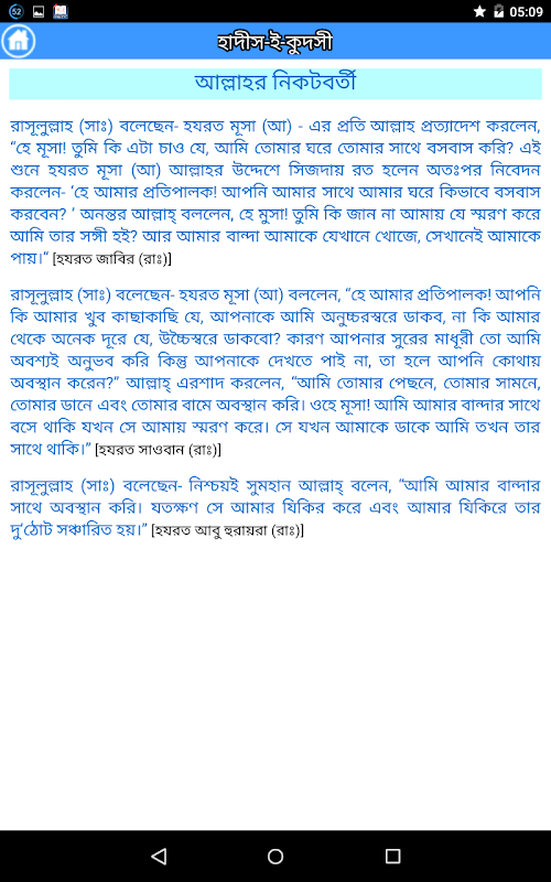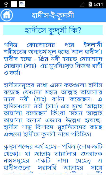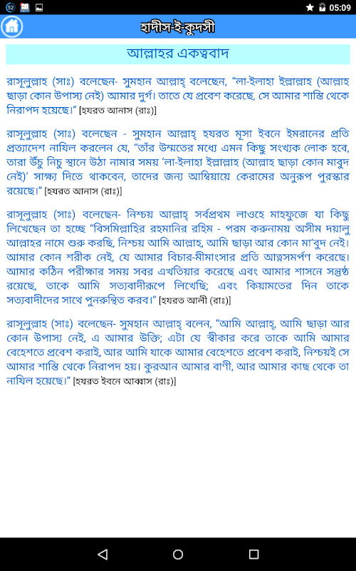 이 애플리케이션은 신성한 나레이션 (알 - 하디스 알 - Qudsi)가 알라, 가장 높으신에 기인, 그에게서 관련이 포함되어 있습니다. 하나님의 메신저 (알라 그를 축복하고 그에게 평화를 줄) 영감 또는 꿈의 방법으로, 알라에서 의미를 받게 한 다음 그 (알라 그를 축복하고 그에게 평화를 줄) 자신의 말씀이 자신의 지역 사회에 알려 것입니다.