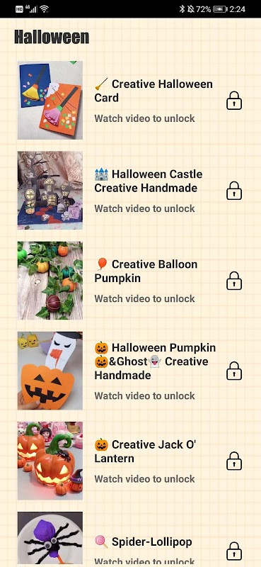 This application contains a collection of Halloween decorations schemes video tutorials. You can follow the video step by step to make the creative works. It has a friendly、simple & easy interface and it is suitable for people of all ages. You can use it offline, you can also save the video tutorial to your phone and share it with your friends.