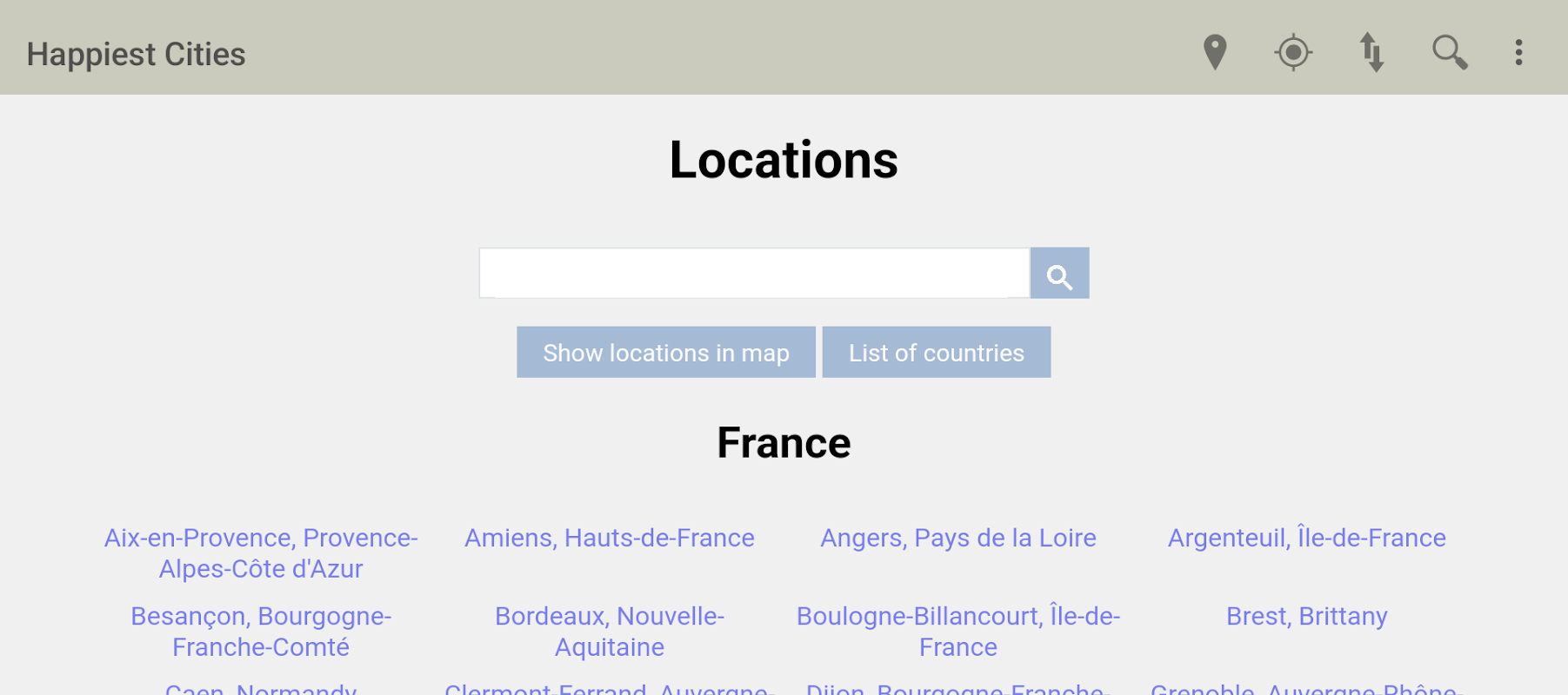 우리 플랫폼의 주목할만한 기능은 사용자가 지구를 탐험하고 지구상에서 가장 행복한 장소를 발견할 수 있도록 지도에 도시를 시각적으로 표현한 것입니다. 이 대화식 접근 방식은 도시 비교를 용이하게 할 뿐만 아니라 사용자가 경험에 몰입하고 이상적인 도시를 상상할 수 있도록 합니다.