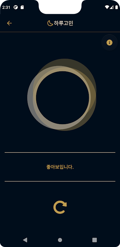 하루 고민🌙 (홈화면에서🌙클릭)에서는 고민하고있는 결정에 도움을 드립니다. 마음속으로 고민을 생각하고 터치하면 결정에 도움이 되는 답을 받을 수 있습니다.