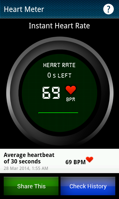 Heart Meter checks your heart rate (beats per minute) and let's you keep a track of your fitness and general well being.
