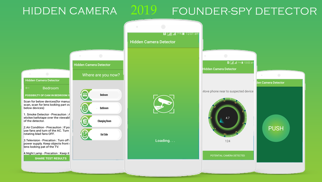 Hidden camera 2019 Founder-spy detector is a new app for yourself and your family privacy. This app can detect the spy camera detector, radio frequency detector, rf detector, spy microphone, dectector, motion detector camera, hidden camera 2019 app should be in your smartphone as a result of anyplace you'll use it to detect the hidden camera detector x, dontspy spy devices detector, radio frequency detector.