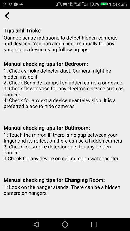 You just have to move the phone with app opened in it. It will beep if there is any potential hidden camera around. This hidden camera detector detects camera and will let you find any camera spying on you.
