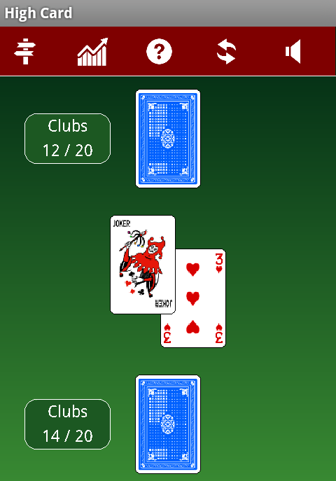 High Card is a classic Dutch card game (als called boxing), your goal is to get the cards from your opponent. Each round you both throw up a card and whoever has the highest of both, collects them. If you throw up the same card, there is an extra throw of two blinds and an upcard. There are three gamemodes, so it's never boring.