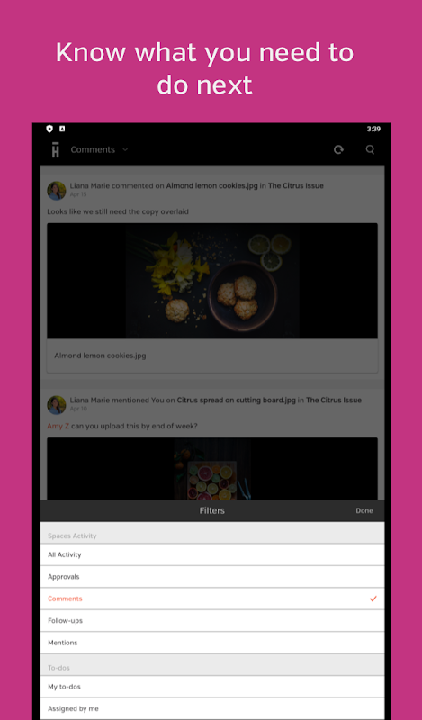 언제 어디서나 Android 용 Hightail 앱의 파일에 액세스하여 창의적인 프로젝트를 계속 진행하고 첫 번째 공유에서 최종 자산으로 빠르게 이동할 수 있습니다.
