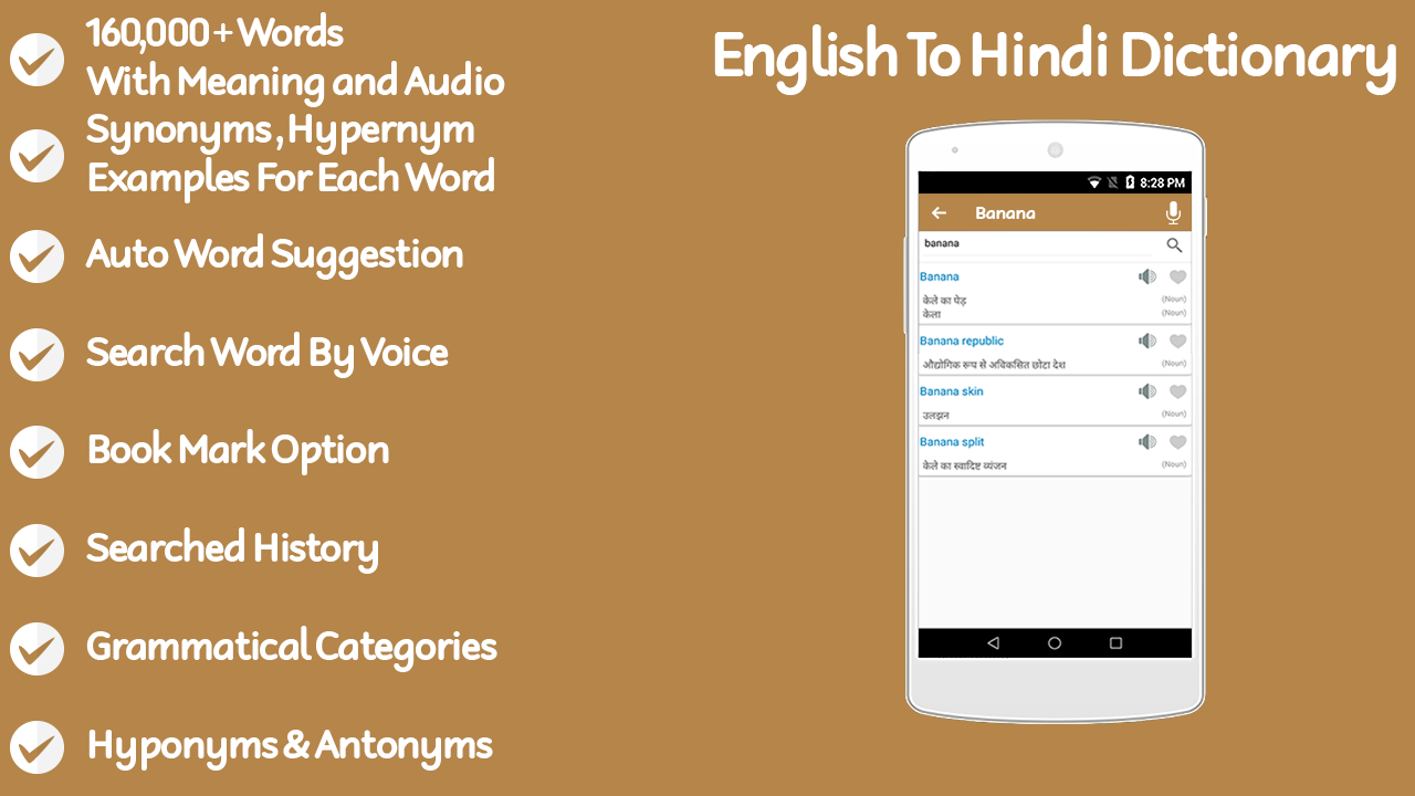 English to hindi dictionary have one lakhs plus word meaning in Hindi and English. This application will help you in building your vocabulary both in English and Hindi. This free dictionary is best offline learning tool. This application have auto words suggestion functionality means you don’t need to type complete word it will show words in suggestion just select your desired word. This application also provide audio pronunciation witch helps in pronouncing correct word in both English and Hindi.