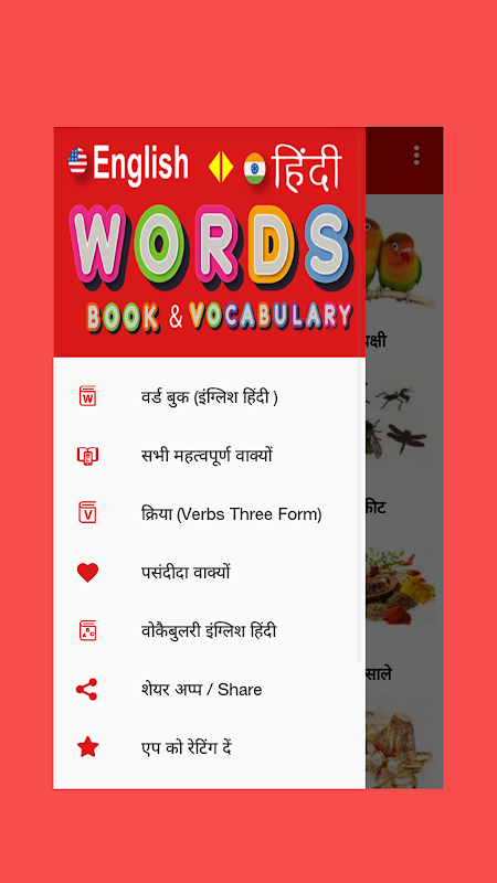 모든 단어를 사진과 범주별로 분류하는 영어 힌디어 단어 책. 사용자 친화적 인 인터페이스.