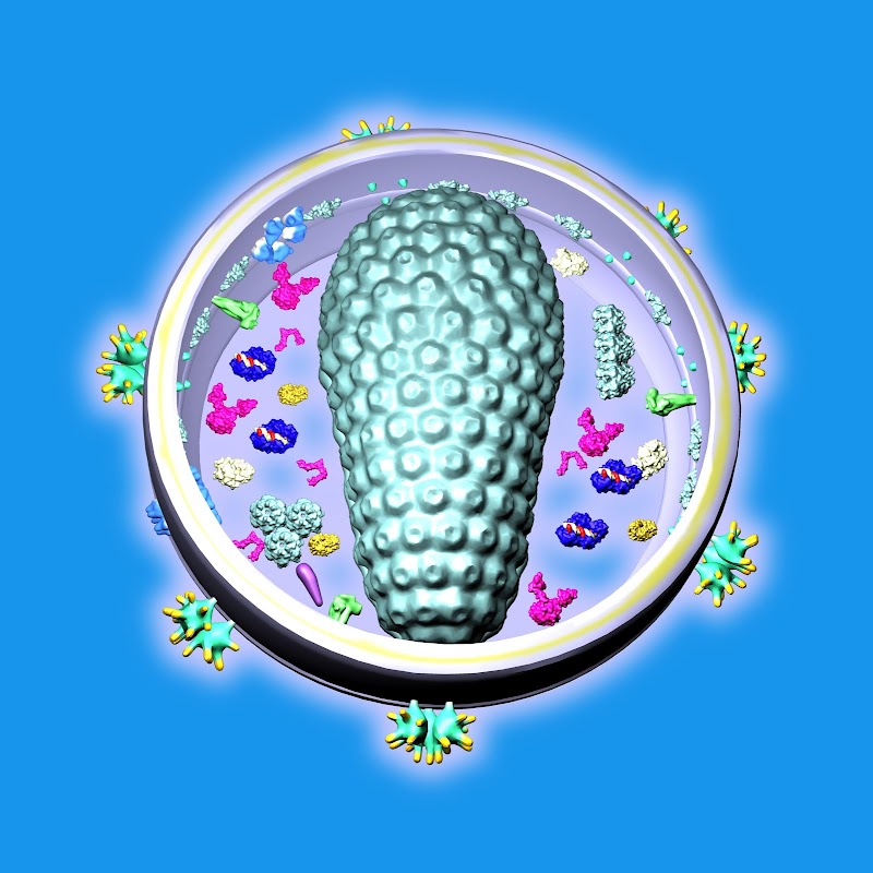 HIV (Human immunodefficiencyvirus) is composed two copies of the single stranded RNA, 5 types of stuctural proteins, 3 types of viral enzymes, and 7 types of accessory proteins along with some proteins taken from the host cell. Its central capsule of the oval shape is surrounded by the round vesicle made of the lipid bilayer (=elementary cell membrane).