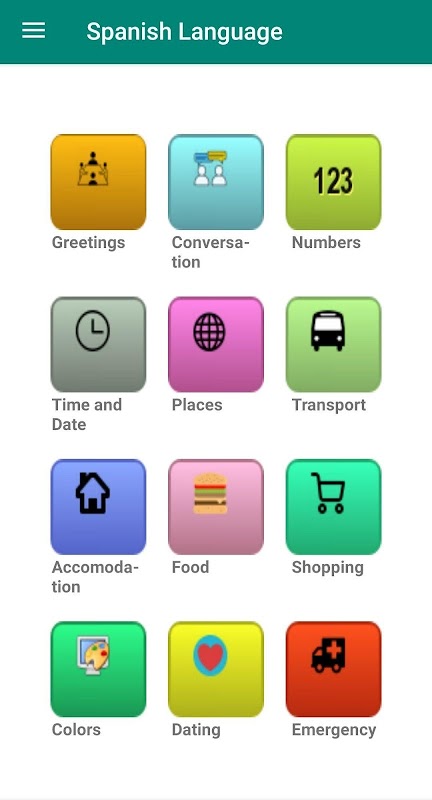 * There is a range of categories for different words for daily life usage such as Greetings, conversation, shopping, numbering, Time and Data, Transport, colors, Emergency, and places.