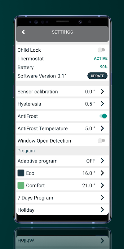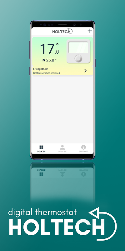 온도 조절기와 결합 된 "Holtech"앱은 스마트 폰을 통해 실내 온도를 제어 할 수있는 옵션을 제공합니다. "Holtech"앱을 사용하면 난방을 조정하고 7 일 전에 난방을 저장하고 정리할 수 있습니다.