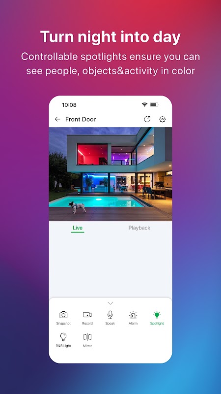 - 스마트 장치를 통해 카메라의 빨간색 및 파란색 조명, 스포트라이트, 사이렌을 원격으로 제어합니다.