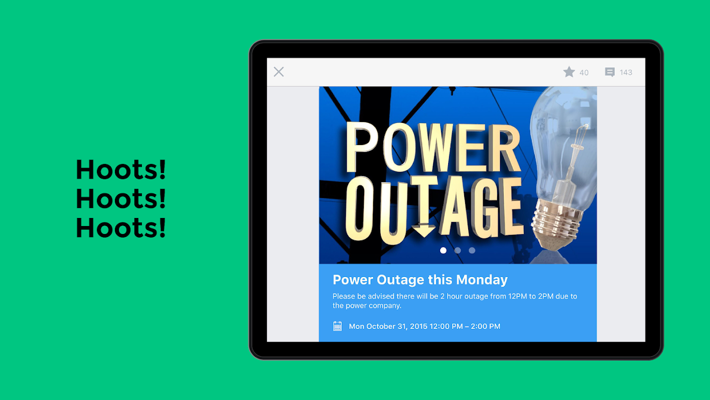 통합 커뮤니케이션 : 당신이, 당신이 별도로 웹 사이트의 내용을 유지하는 일이 사라지고, 조직의 참여를 구동 담당 자세한 뉴스 레터가있는 경우, 건물에 별도의 그룹 응용 프로그램 및 업데이트 화면을 유지한다. HootBoard 그들 모두를 연결 한 플랫폼입니다. , 지역 사회 HootBoard을 작성하여 회원을 초대하고 그들이 야유를 게시 할 수 있습니다. 간단한 커넥터와, 관리자가 원활이 모든 콘텐츠 로비에서 자신의 웹 사이트 또는 화면으로 운항 할 수있는 내용의 조직을 사용. 회원들도 보드에서 가장 인기있는 활동과 이메일을 통해 뉴스 레터를 얻을 수 있습니다 또는 그들은 항상 Hootboard.com에서 우리의 앱을 통해 자신의 HootBoard 커뮤니티에 액세스 할 수 있습니다.