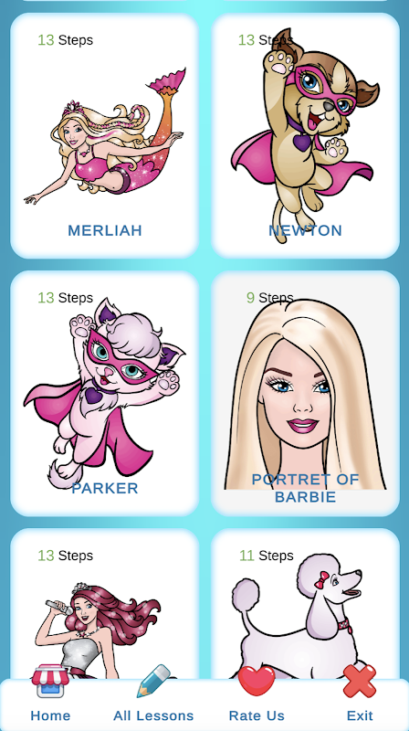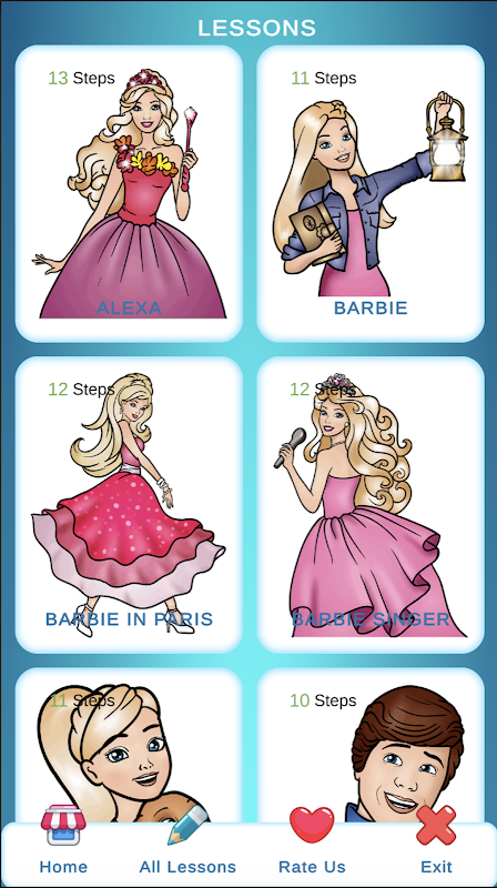 당신은 바비를 그리는 방법 단계별 응용 프로그램의 페이지에 있으며, 이는 특히 하루에 그리는 방법을 배우고 싶은 사람들을 위해 특별히 설계되었습니다. 그림 그리기를 마스터하고 좋아하는 바비 만화/영화 캐릭터의 멋진 초상화를 만드는 것이 꿈이라면 바비 인형 레슨을 그리는 방법을 자유롭게 다운로드하세요.