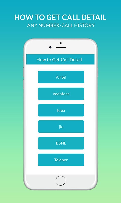 Quick and intuitive application that helps you to Know call history or other details How to get call details of any number application helps the Indian prepaid telecom users to find the numbers for specific operations like Recharge, Main, Message, Net Balance enquiry, Finding own number and Customer care number.
