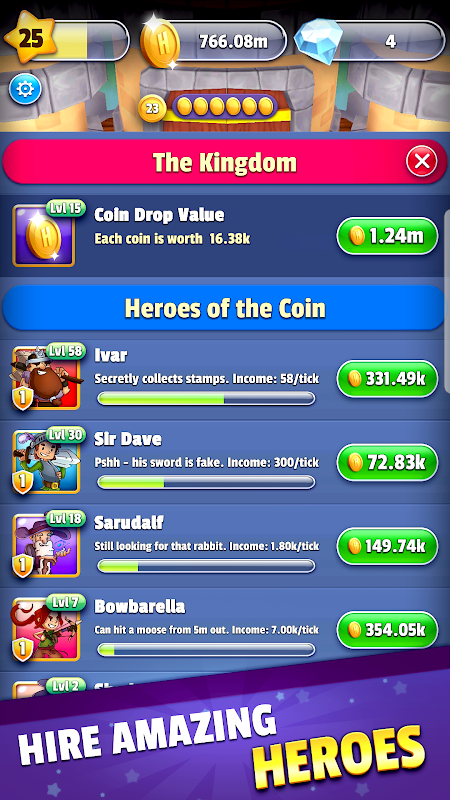 💸 Heroes to hire and level so you earn gold all the time - even while you are not playing!