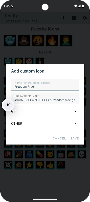 🌍 사용자 지정 아이콘 — WEBP 또는 GIF URL에서 나만의 아이콘을 추가하세요.