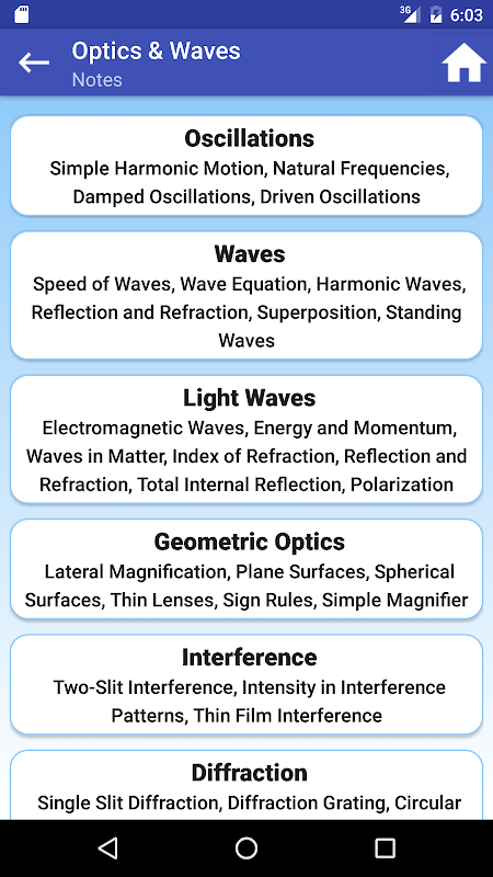 Ideal Physics is the perfect "study buddy" app for any physics or engineering university student. This app gives you the tools you need to expand your understanding of the physical sciences. Its simple navigation allows you to quickly find and delve into a particular subject area, ranging from astrophysics to quantum mechanics. Each subject area contains key equations, notes, illustrative images, practice problems with answers, and step-by-step solutions. These practice problems will provide the foundation for exceling at homework and upcoming exams.