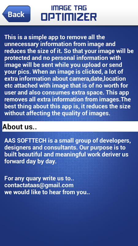 This is a simple app to remove all the unnecessary information from image and reduce the size of it. So that your image will be protected and no personal information with image will be sent while you upload or send your pics. When an image is clicked, a lot of extra information about camera,date,location etc.. attached with image that is of no worth for user and also consumes extra space. This app removes all extra information from images. The best thing about this app is, it reduces the size without affecting the quality of image.