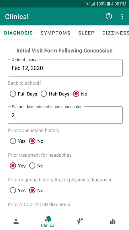 추가 임상 도구 및 설문 조사를 통해 초기 뇌진탕 진단, 손가락 반응 시간, 통증, 수면, 현기증 및 증상에 대한 설문 조사를 할 수 있습니다.