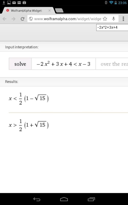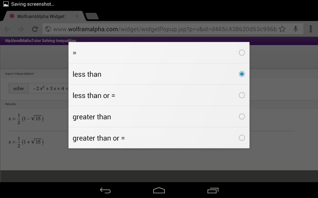 Enter an inequality that is <, <=, >, >= or = and this works out the solution for you. It basically does just what it says on the tin. So if you have homework that you need to check the answers for, then look no further.