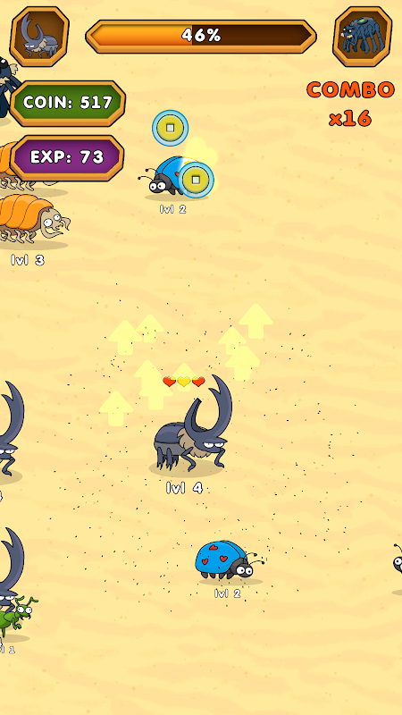 저레벨 곤충을 먹고 보너스를 모으고 진화하고 강해집니다.
